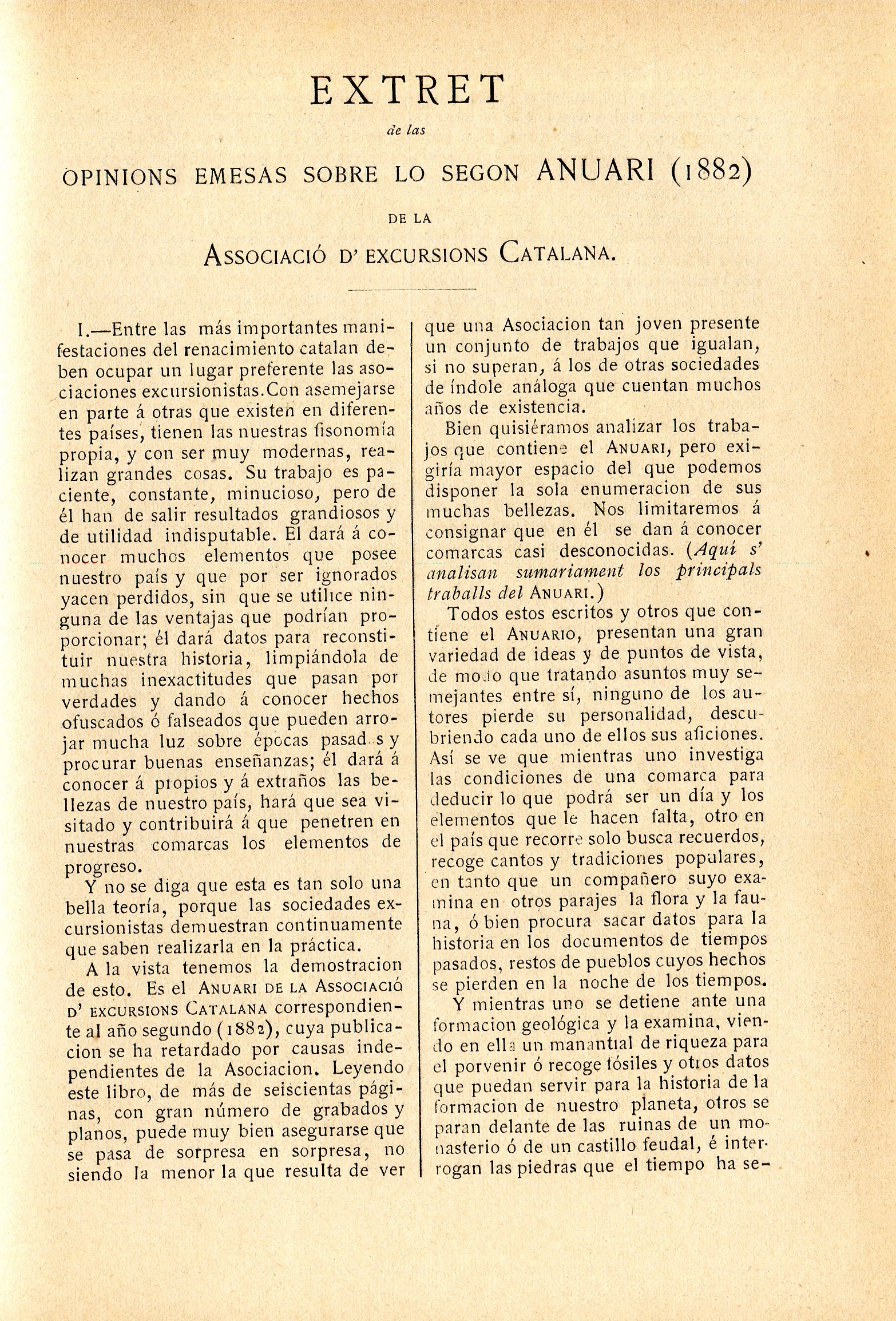 Extret de las opinions emesas sobre lo segon Aniari (1882) de la Associació d'Excursions Catalana