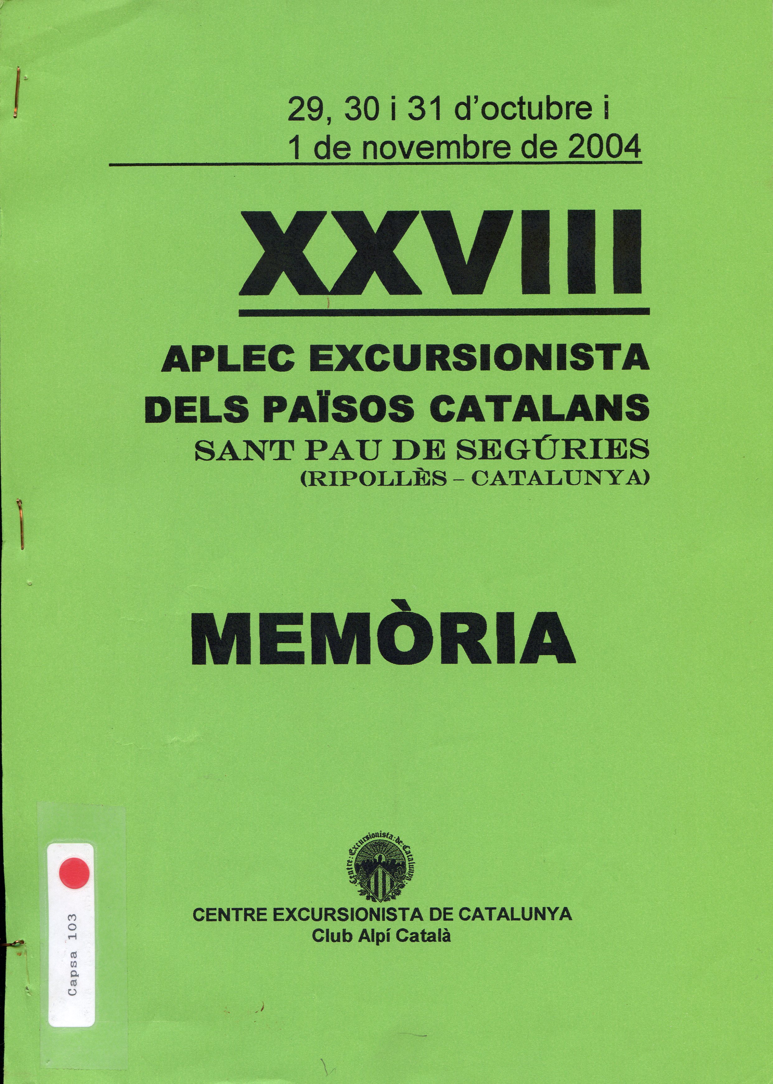 XXVIII Aplec Excursionista dels Països Catalans : Sant Pau de Segúries (Ripollès - Catalunya) : Memòria : 29, 30 i 31 d'octubre i 1 de novembre de 2004