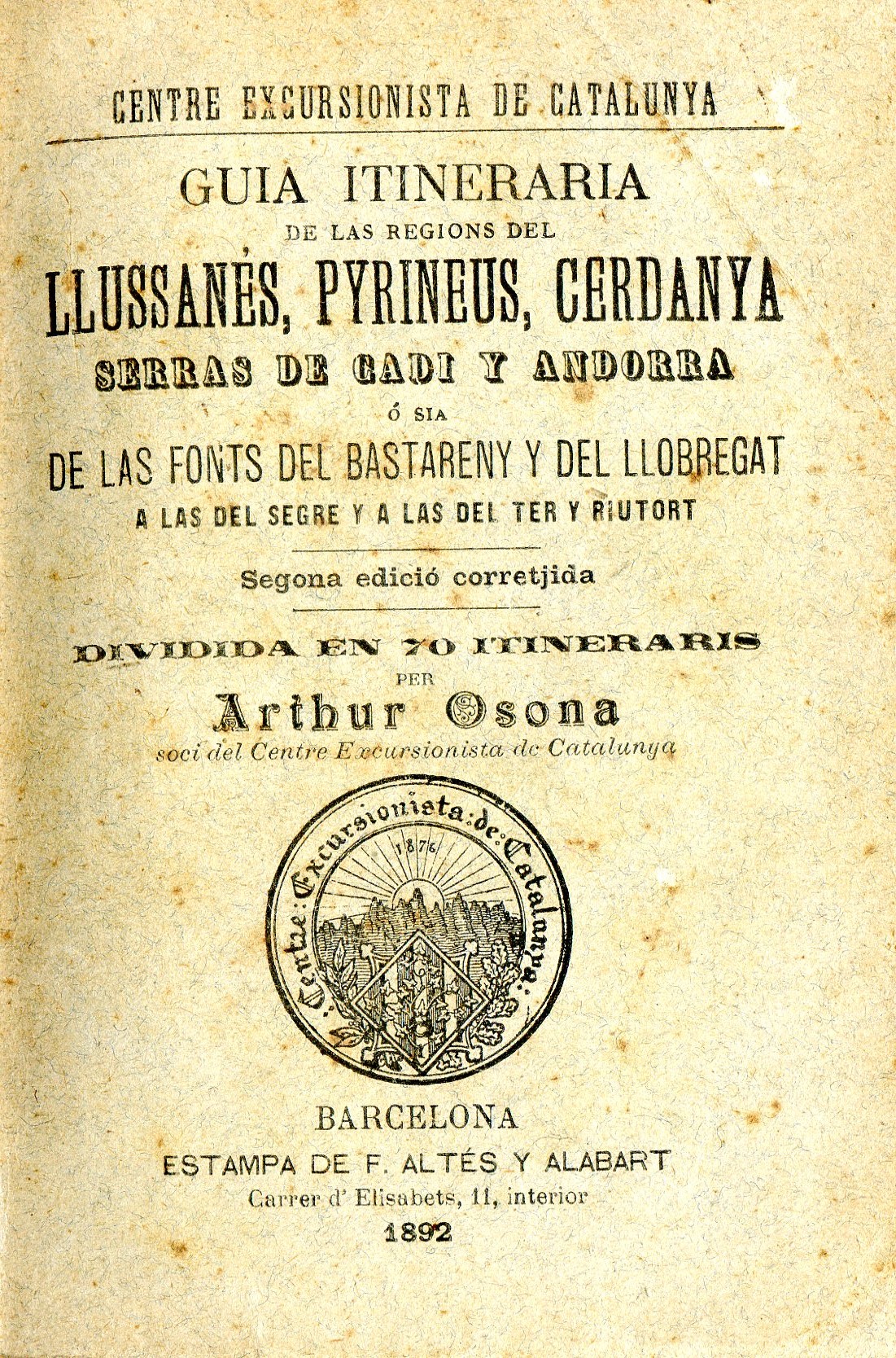 Guia itineraria de las regions del Llussanés , Pyrineus y Andorra ó sia de las Fonts del Bastareny y del Llobregat, á las del Segre y a las del Ter y Riutort : Dividida en 70 itineraris
