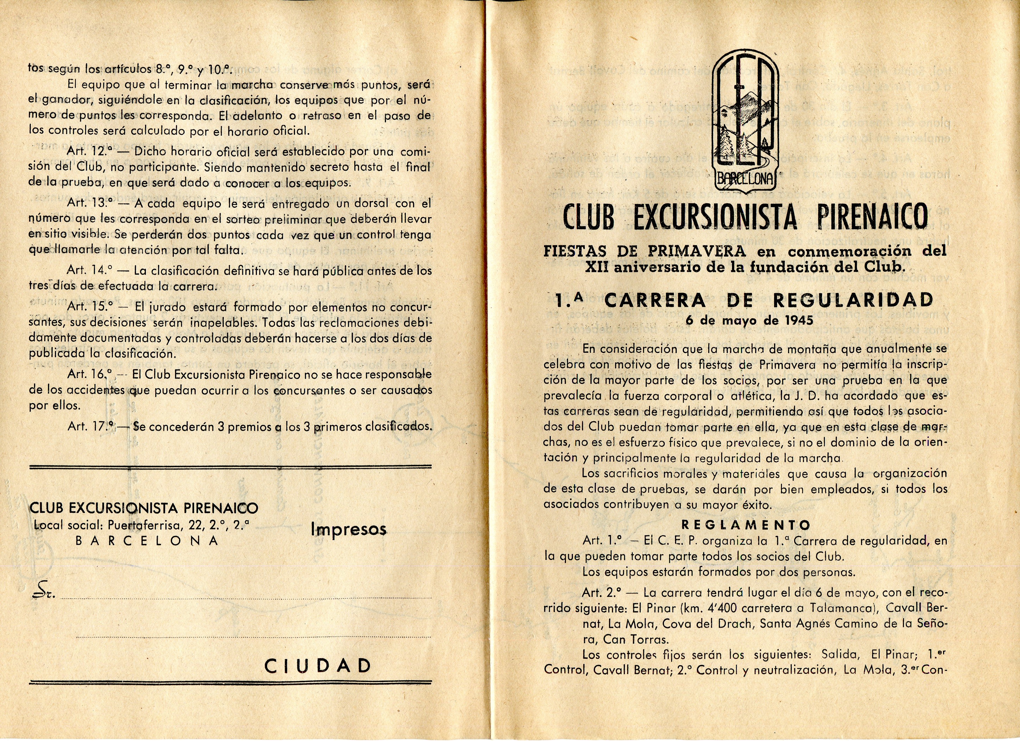 Fiestas de Primavera en conmemoración del XII aniversario de la fundación del Club : 1.ª Carrera de Regularidad : 6 de mayo de 1945