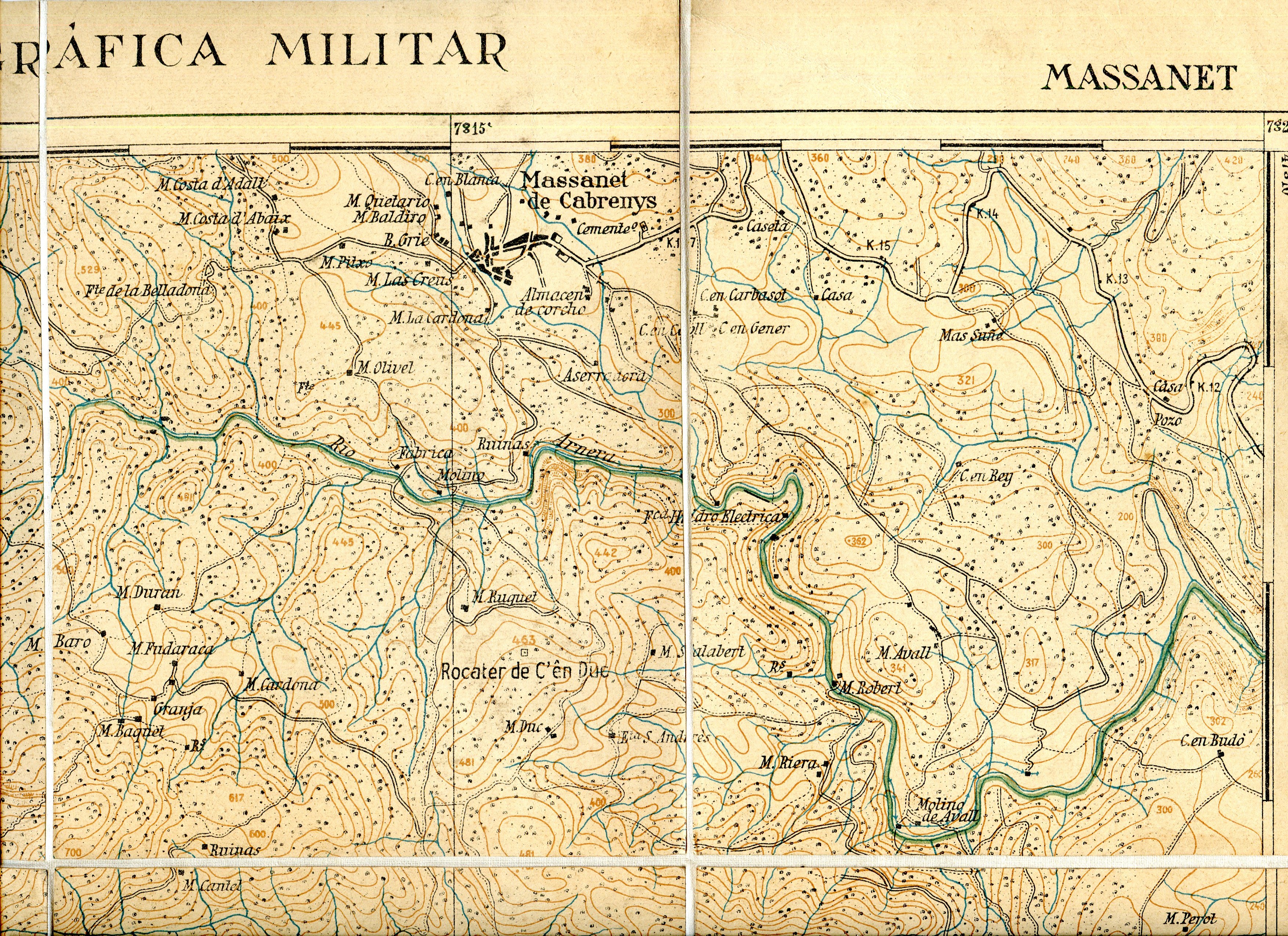 3 tintes : marró (corbes de nivell), blau (rius) i negre ( topònims, camins, poblacions)