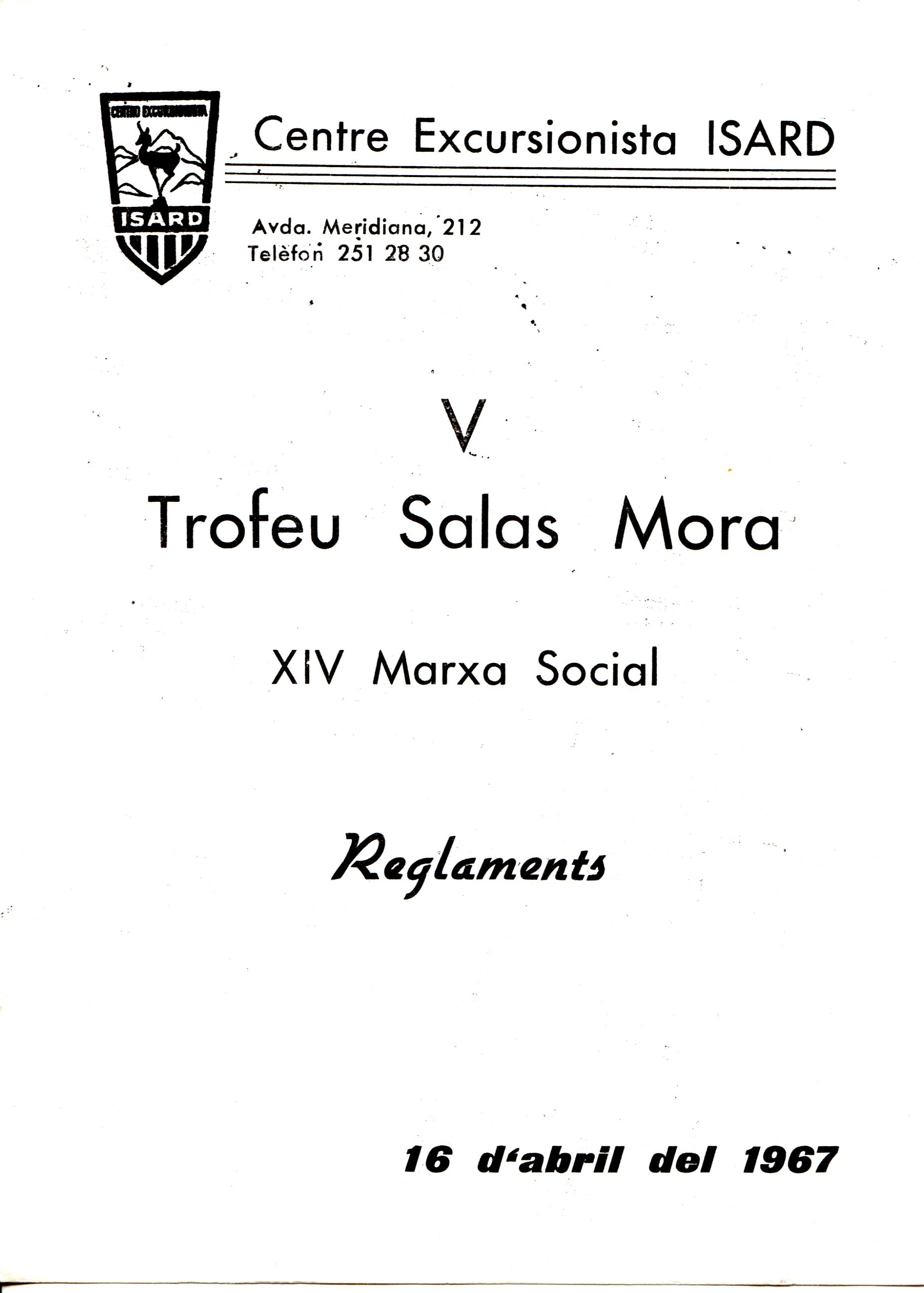 XIV Marcha Social Excursionista de Regularidad : I Trofeo Salas Mora : Reglamento : Organizada por el Centro Excursionista Isard : 16 abril 1967