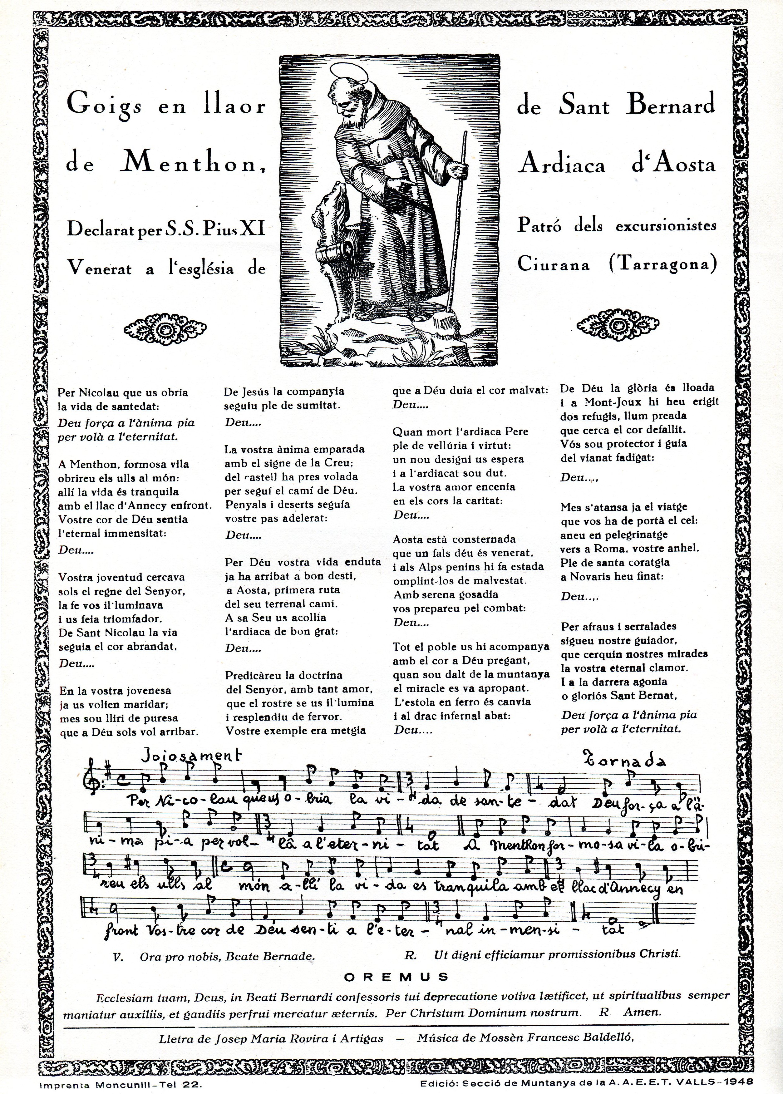 Goigs en llaor de Sant Bernard de Menthon, Ardiaca d'Aosta : Declarat per S. S. Pius XI : Patró dels excursionistes : Venerat a l'esglésis de Ciurana (Tarragona)