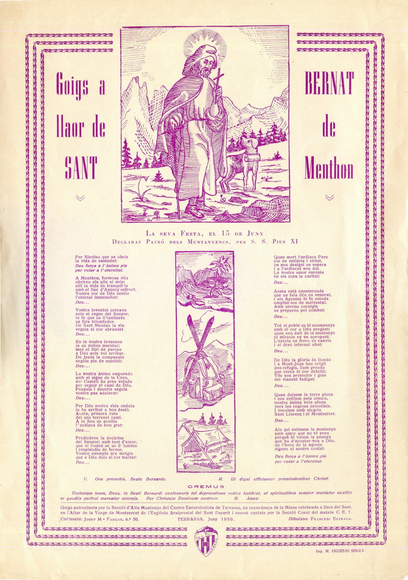 Goigs a llaor de Sant Bernat de Menthon : La seva Festa, el 15 de juny : Declarat Patró dels Muntanyencs, per S. S. Pius XI
