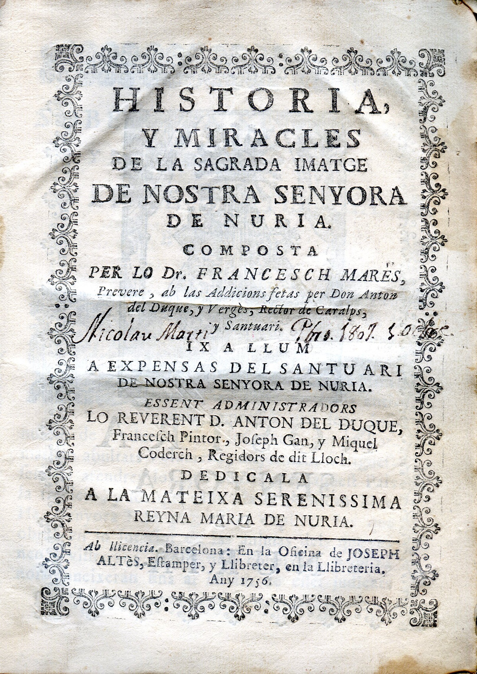 Història, y miracles de la sagrada imatge de nostra senyora de Núria